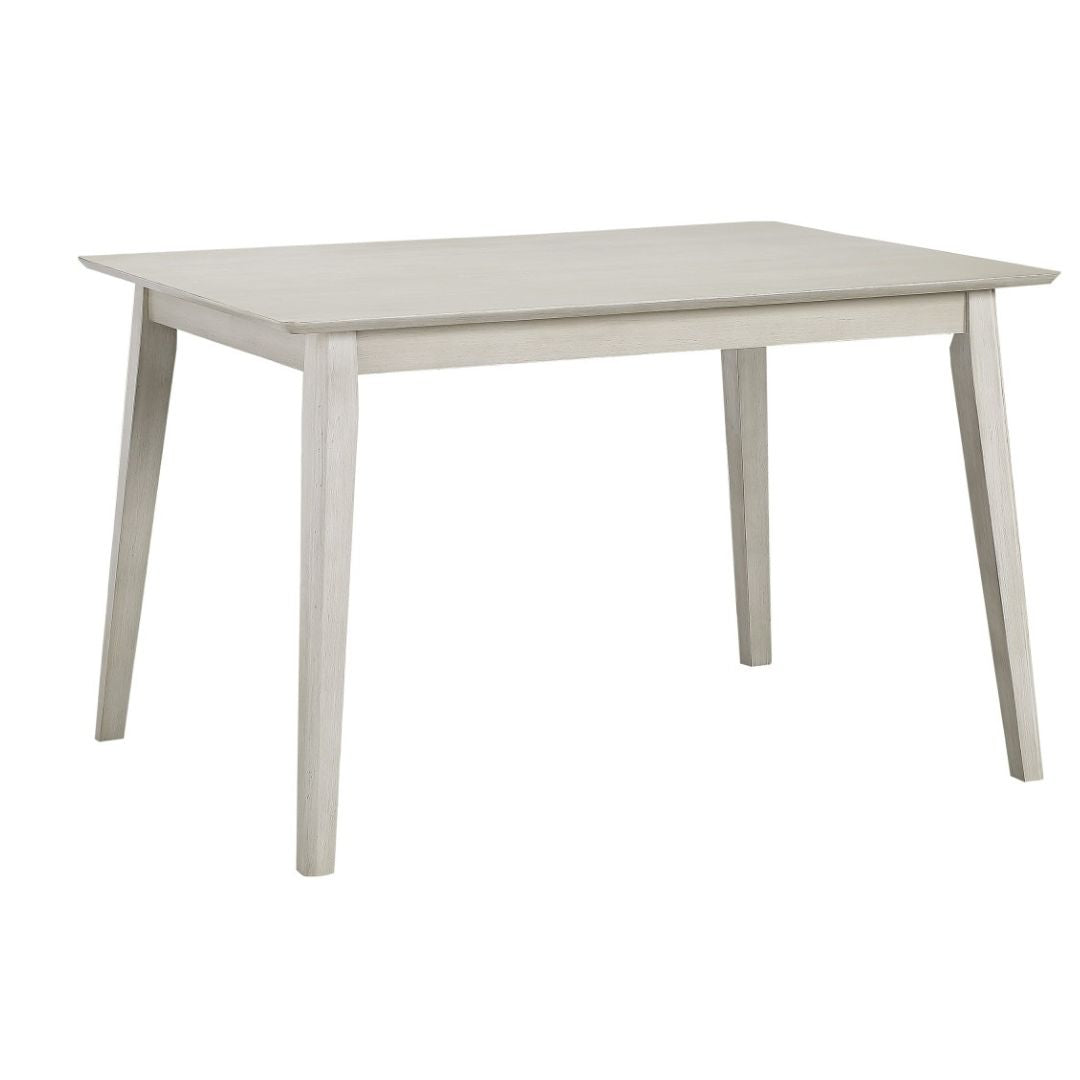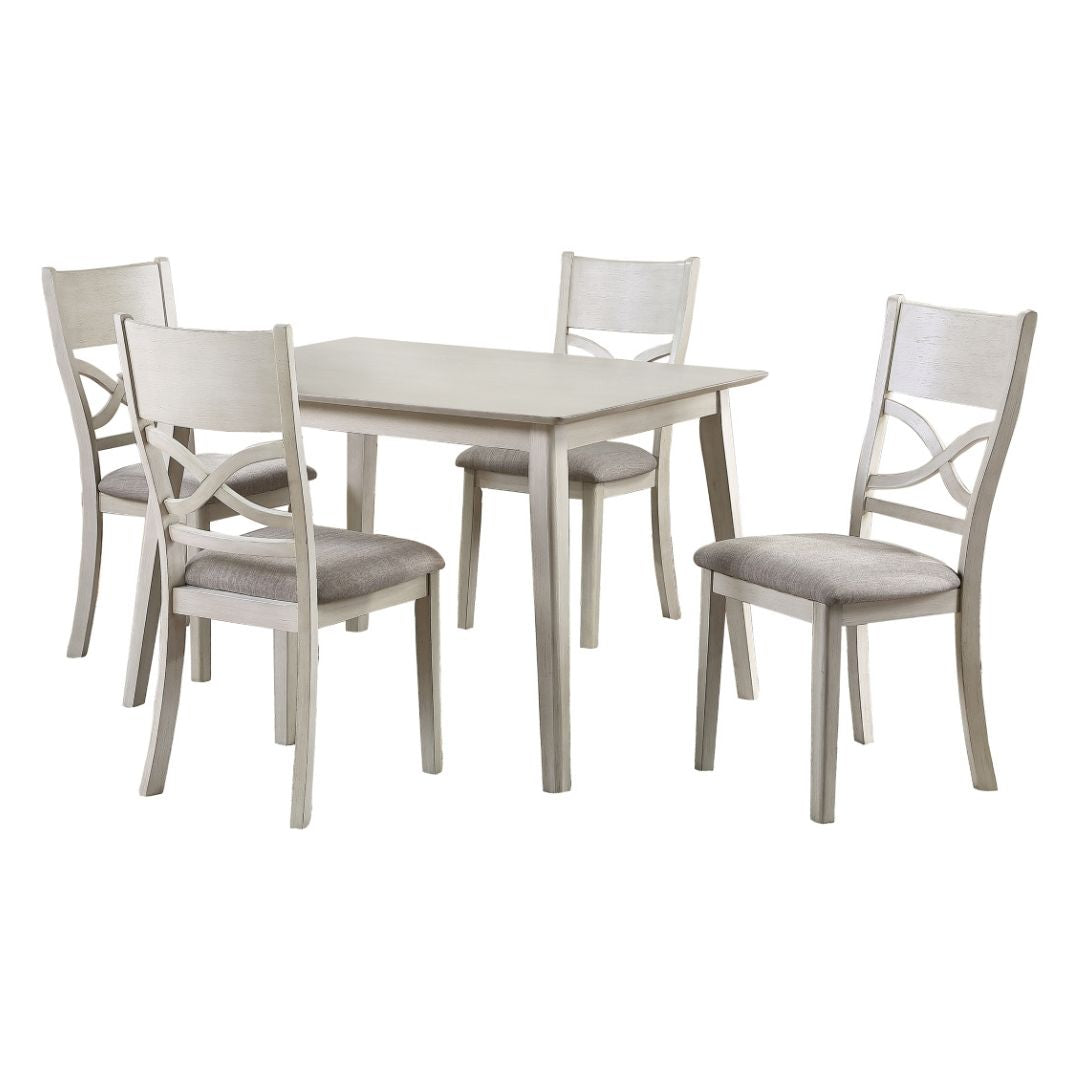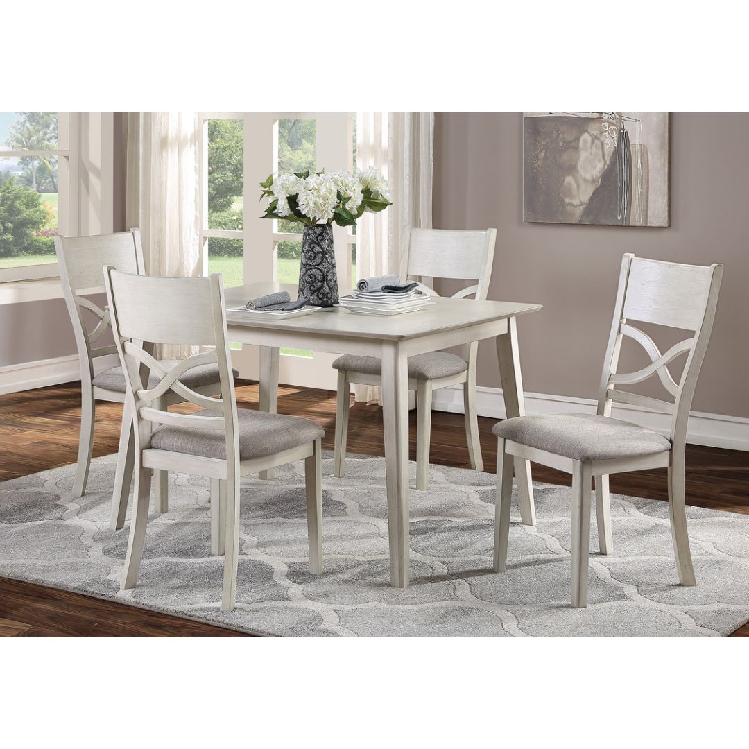 The Anderson Collection is a charming 5-piece dining set designed for casual, everyday dining spaces. Seating four comfortably, this set pairs an antique white acacia-veneered rectangular table with four coordinating wood-framed chairs. Each chair features soft gray linen-like upholstered seats, bringing together a clean transitional look that works beautifully in both modern and classic interiors.