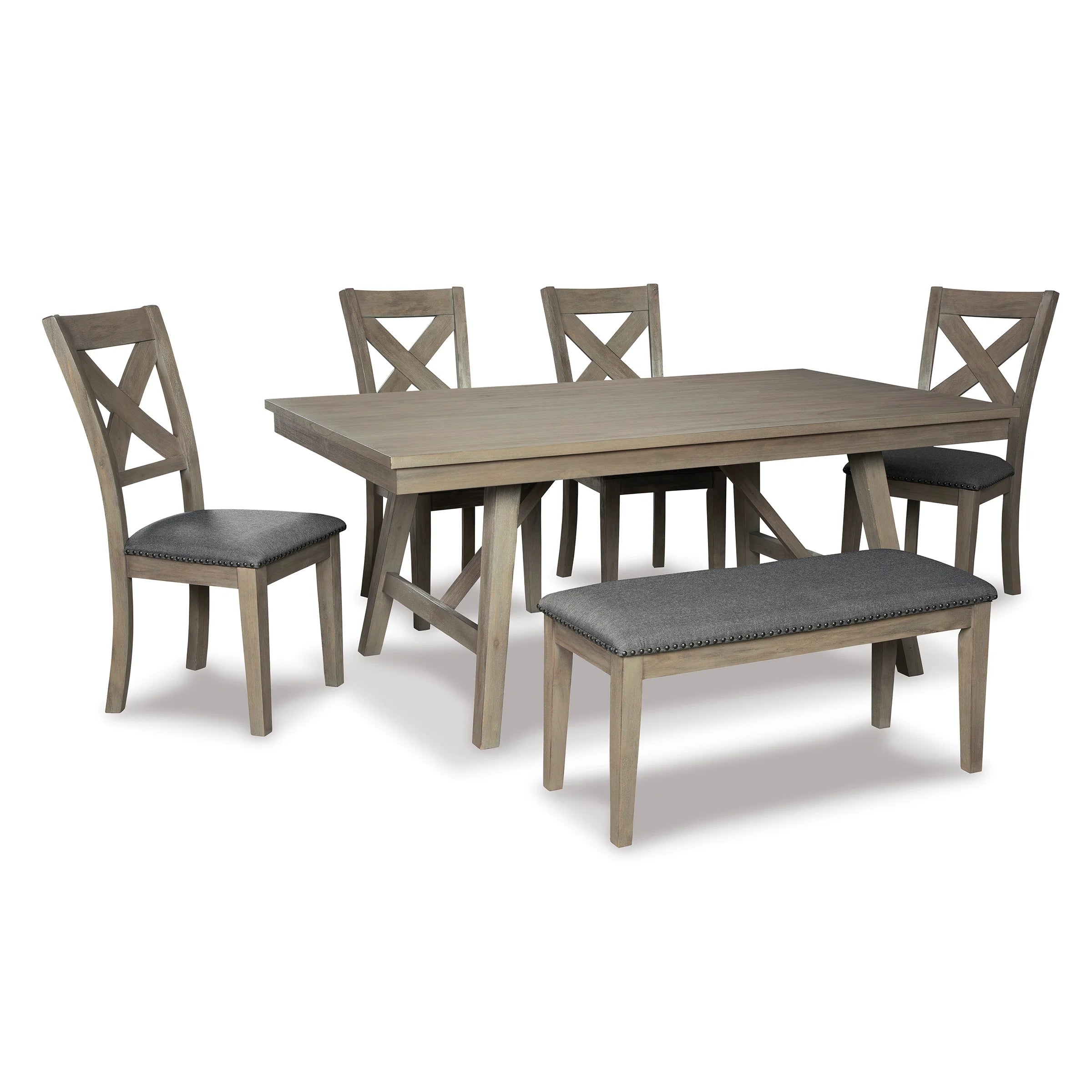 Modern farmhouse has never looked better. This dining set allures with a warm gray finish, wire-brushed texture and country-inspired crossbuck trestle design. Equipped with six upholstered chairs, this dining set will have you wanting to stay in with family a little while longer.