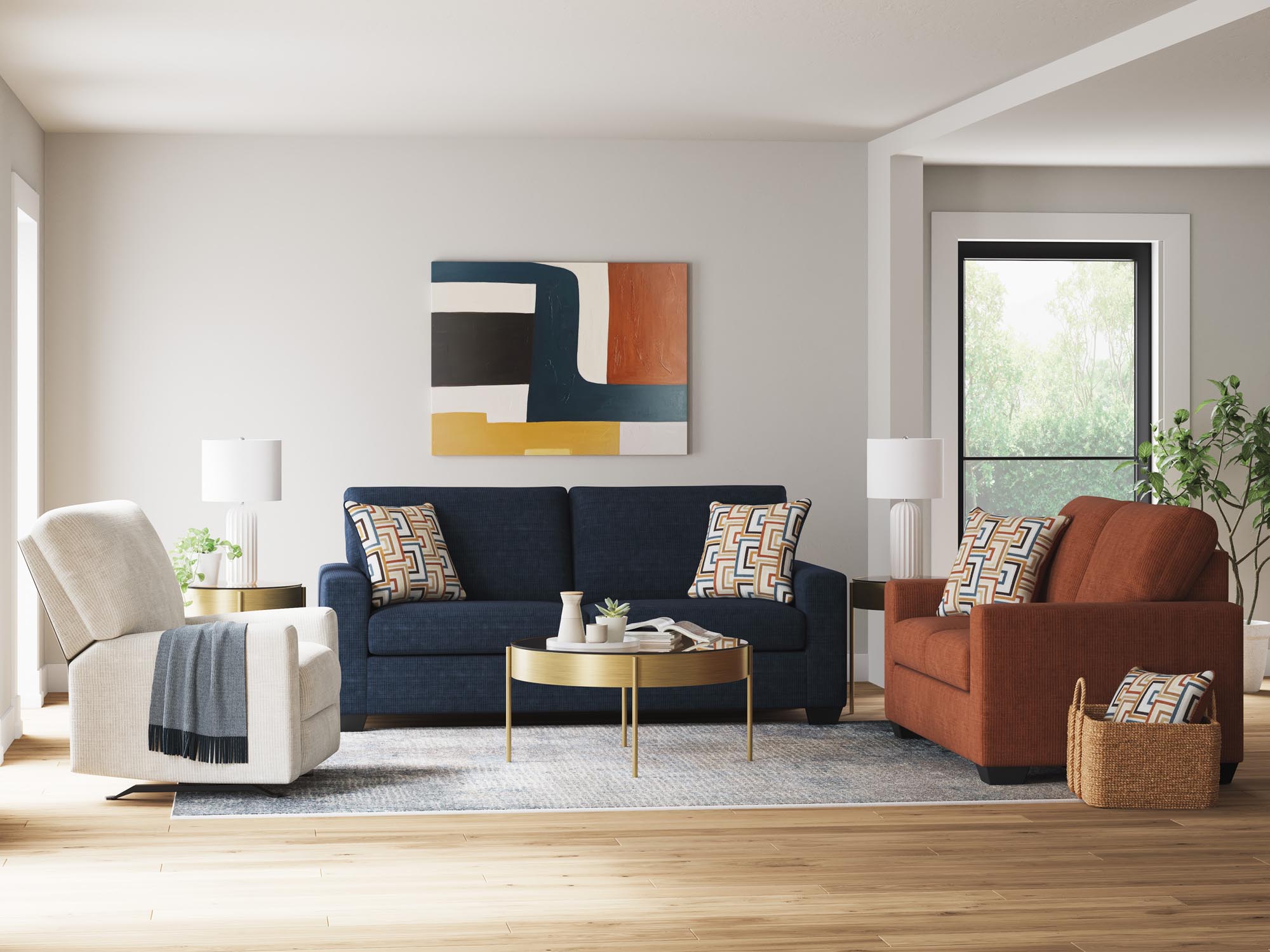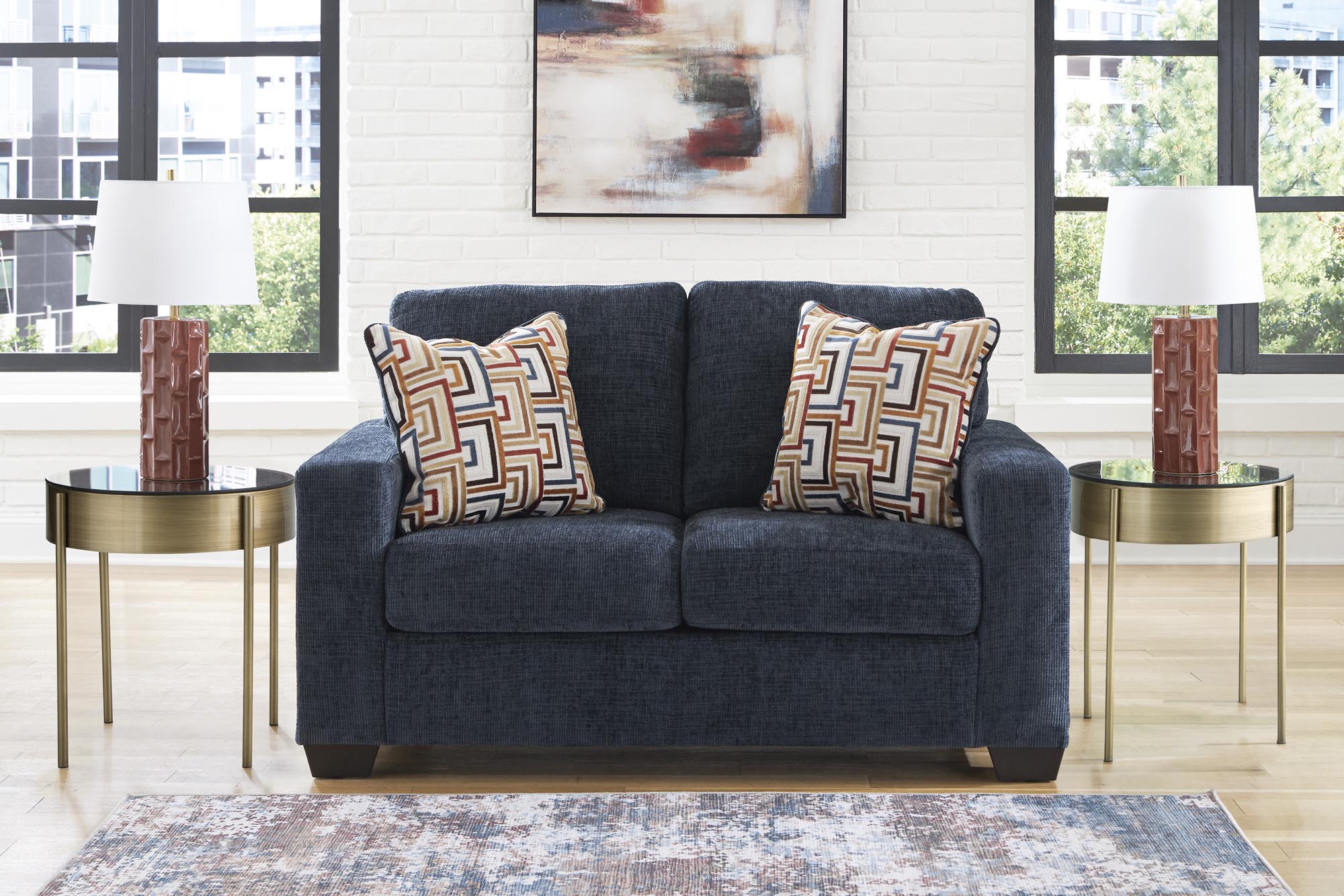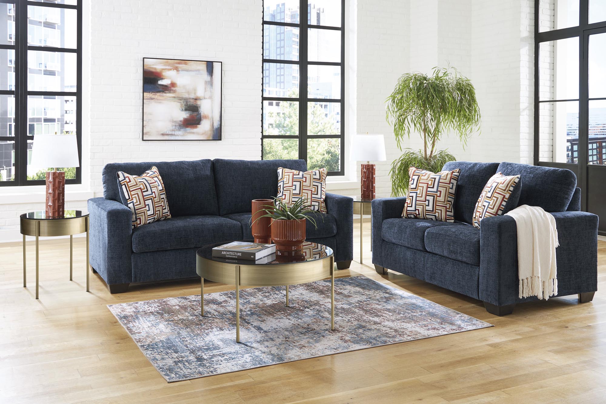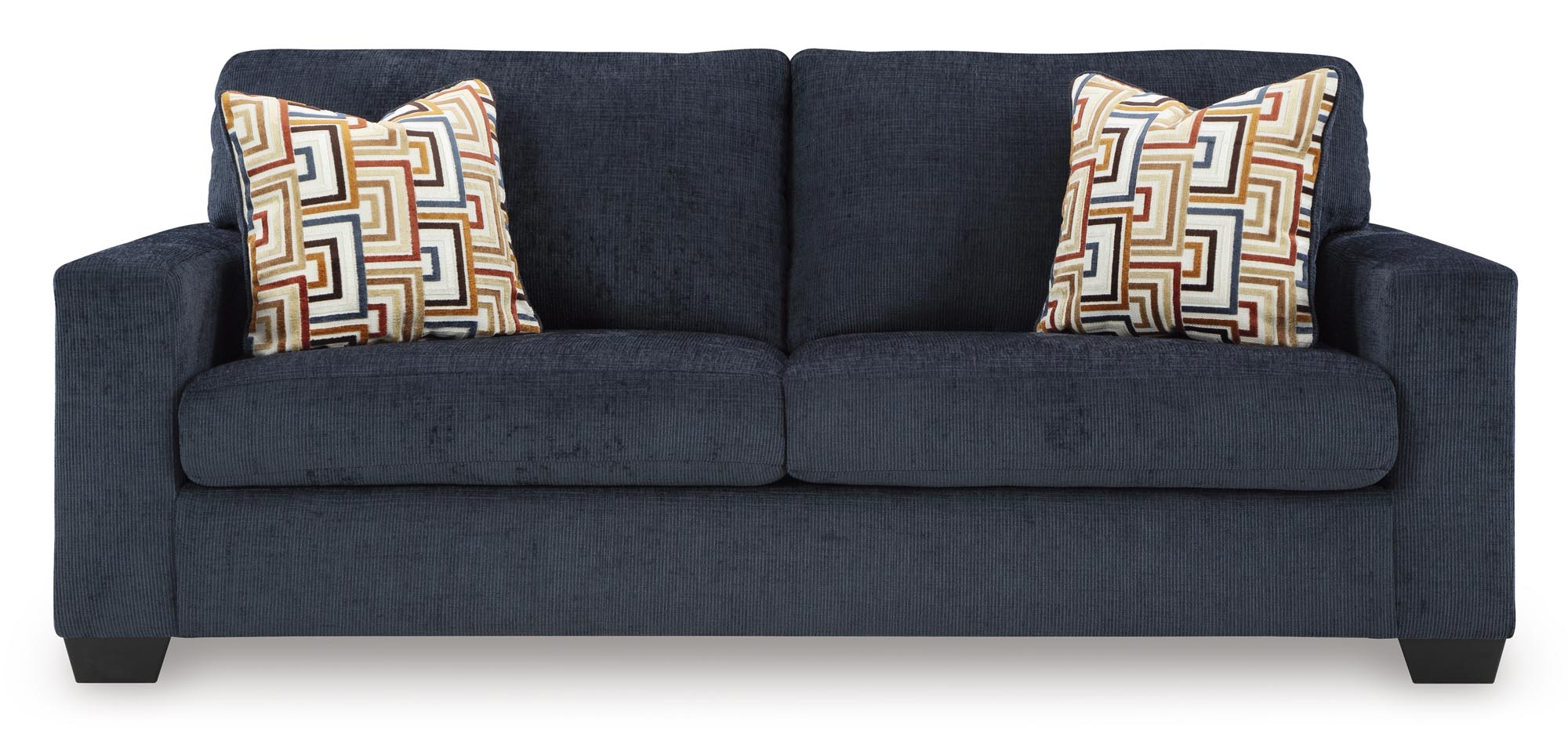 Make a bold statement with this stylish sofa and loveseat set, designed to liven up your living room with vibrant character. The trend-right navy blue upholstery delivers a confident pop of color, while bold accent pillows add an eclectic flair. Combining posh style with everyday comfort, this set is a perfect match for contemporary spaces that embrace personality and warmth.