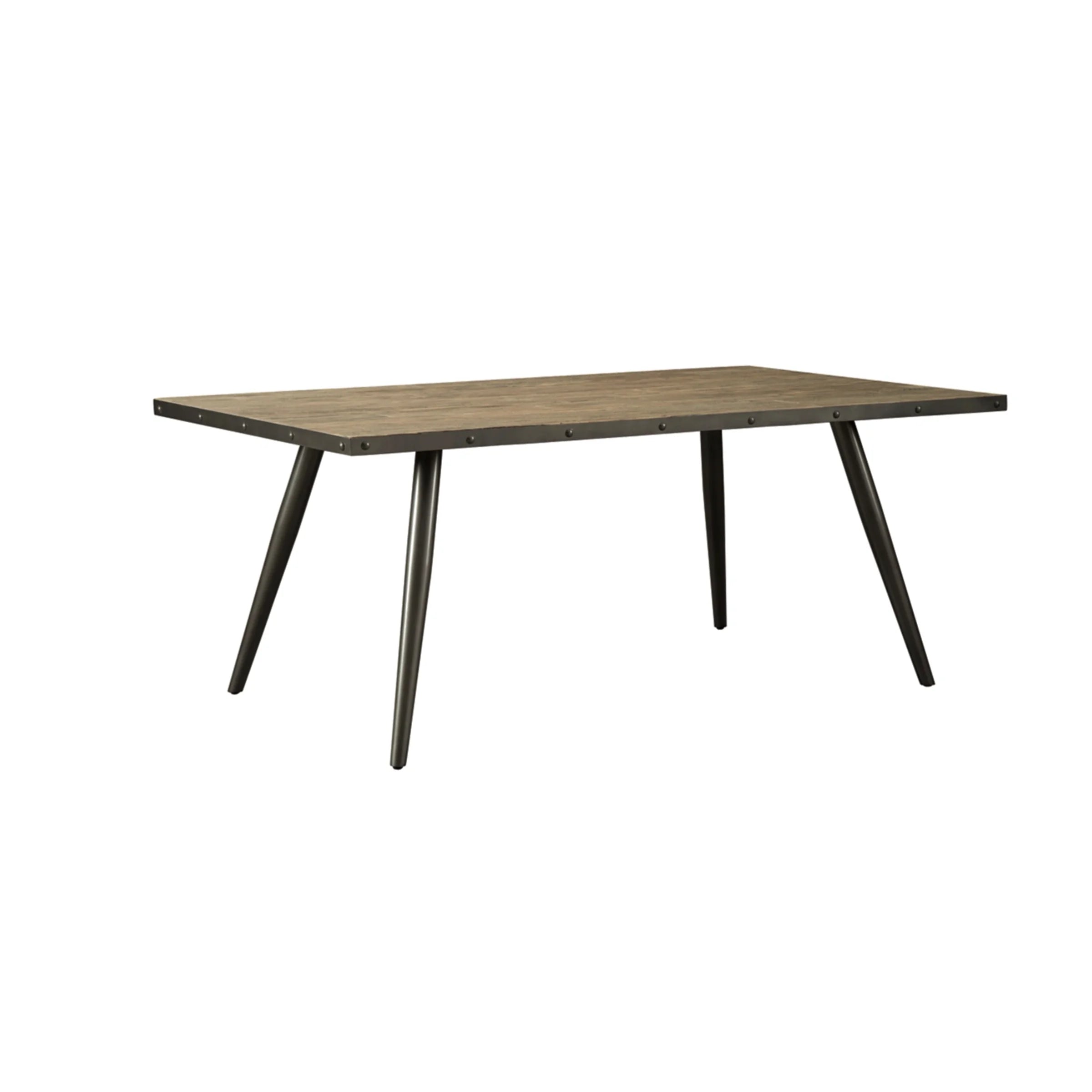 Showcasing an artfully distressed butcher block top crafted of elm veneers and treated to a weathered, wire brushed finish, the Coverty rectangular dining room table invites you to gather round in style. Wraparound metal banding with nailhead complements this table’s canted legs so well, adding a punch of cool character to the mid-century inspired design.