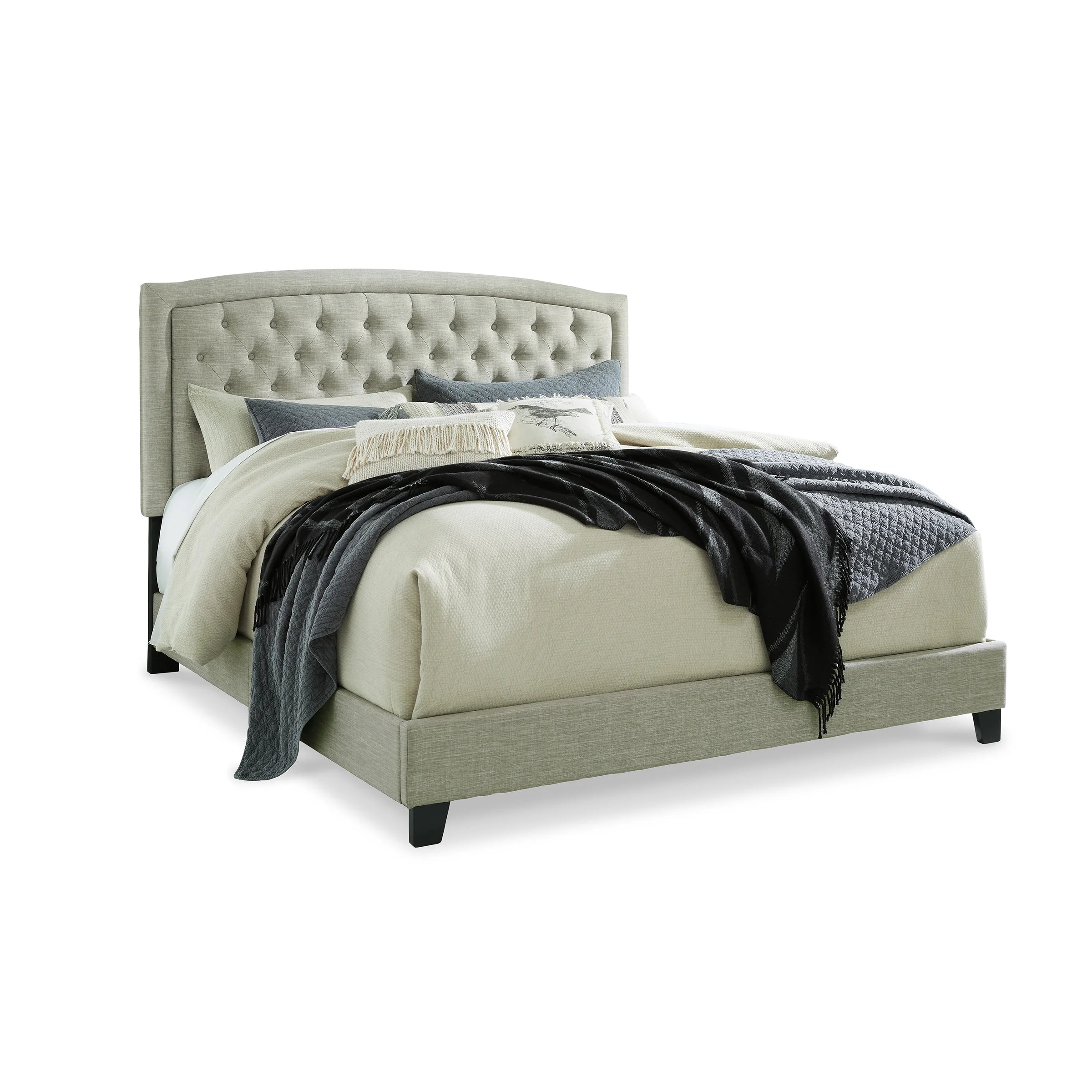 Create a luxurious bedroom oasis without breaking the bank with this queen upholstered bed. The textured light gray fabric on the arched tufted headboard adds a modern touch, while the footboard and rails are adorned in complementary cool gray shades.