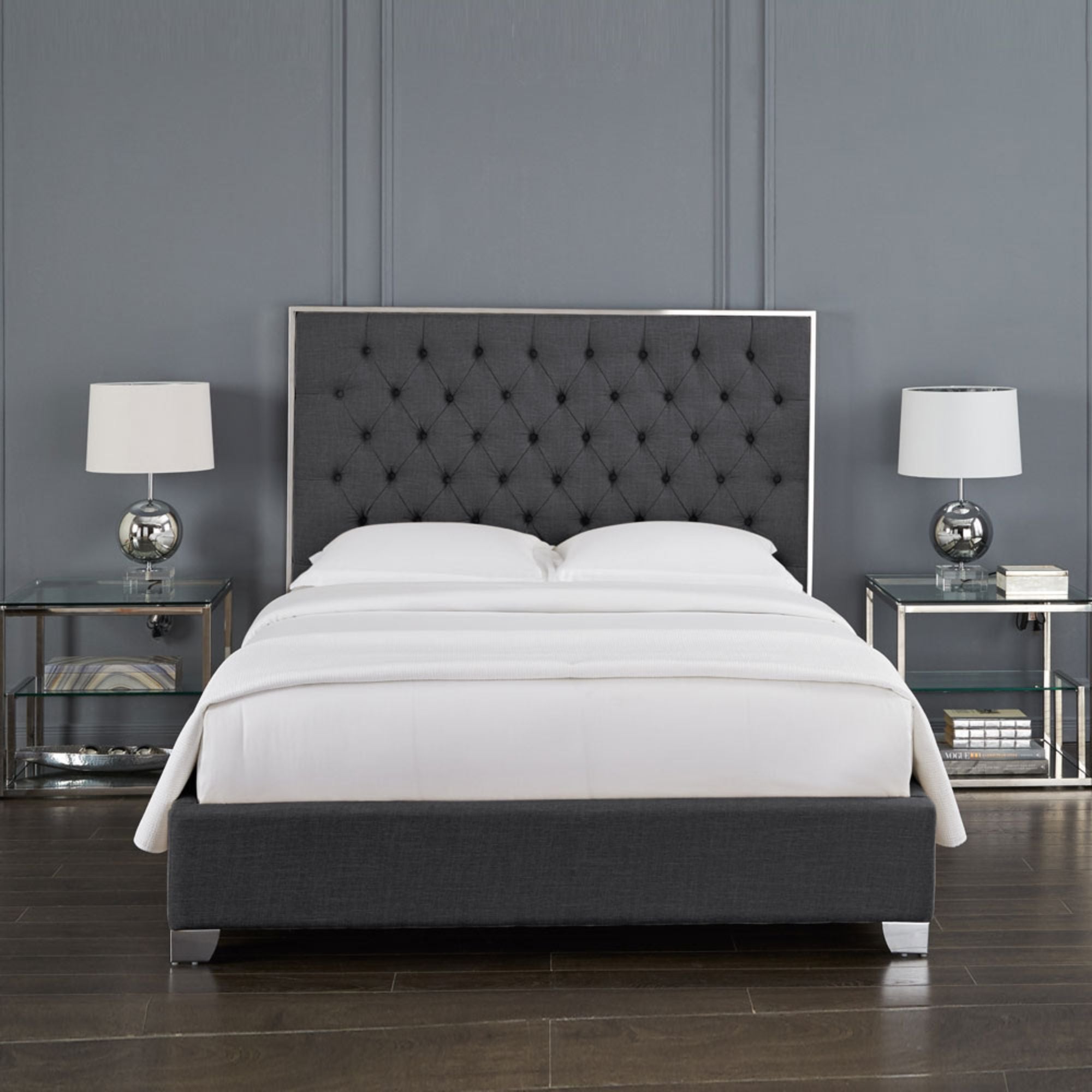 Elevate your bedroom with the refined elegance of the Kroma Bed. Upholstered in a soft dark grey fabric, this design features a beautifully button-tufted headboard framed in polished stainless steel for a modern, upscale finish. The clean lines and neutral tone create a luxurious yet versatile look that pairs effortlessly with both contemporary and classic décor.