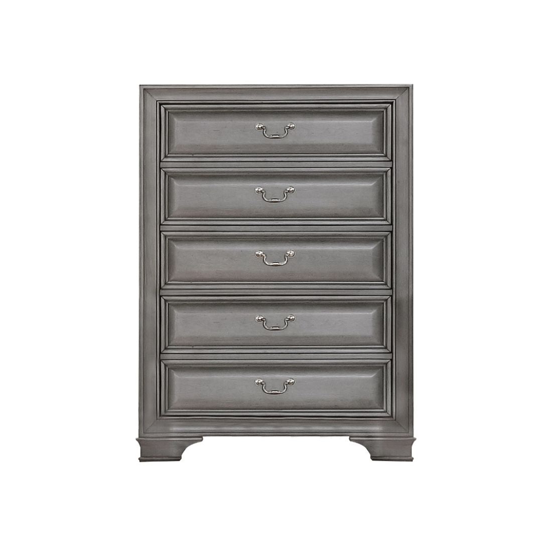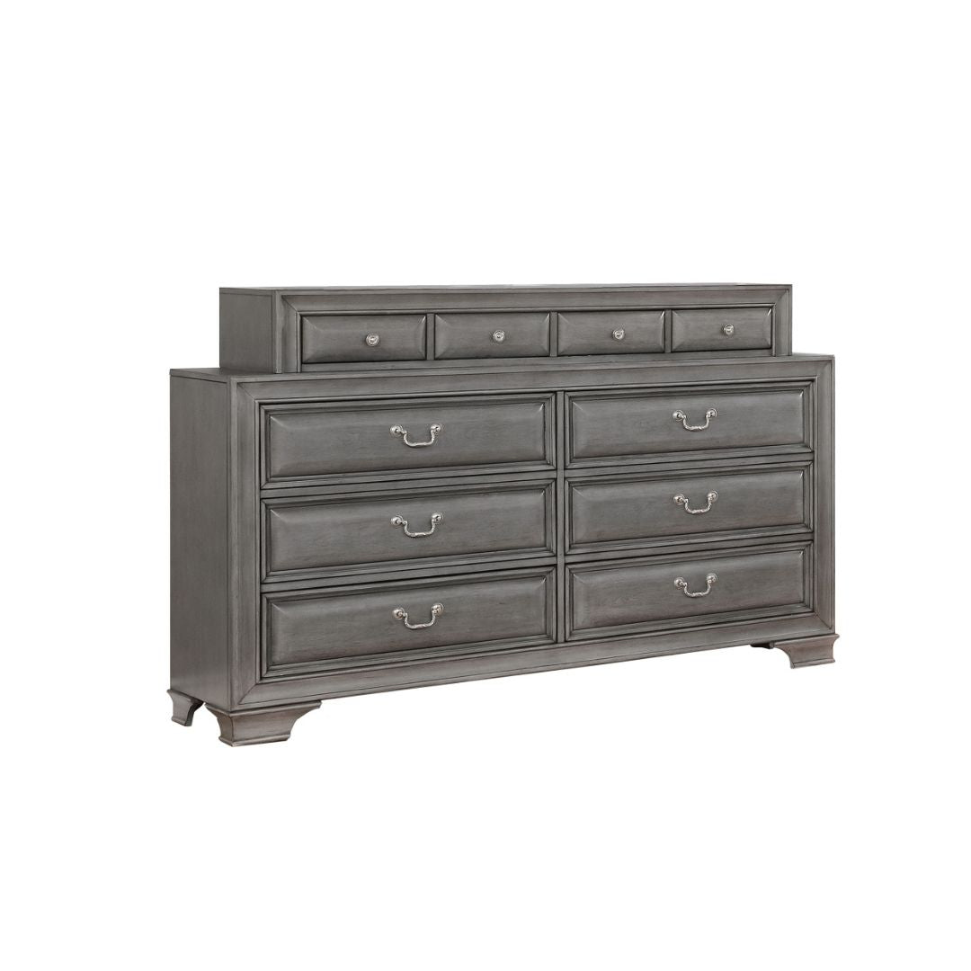 The Milton Collection combines classic charm with transitional styling in a grey wood finish. Sleigh-style headboard and 6 built-in storage drawers (2 in footboard + 4 in side rails) provide both elegance and practical functionality. Detailed craftsmanship includes picture-frame paneling, dovetail drawers and antique silver handles. Also available in cherry brown.