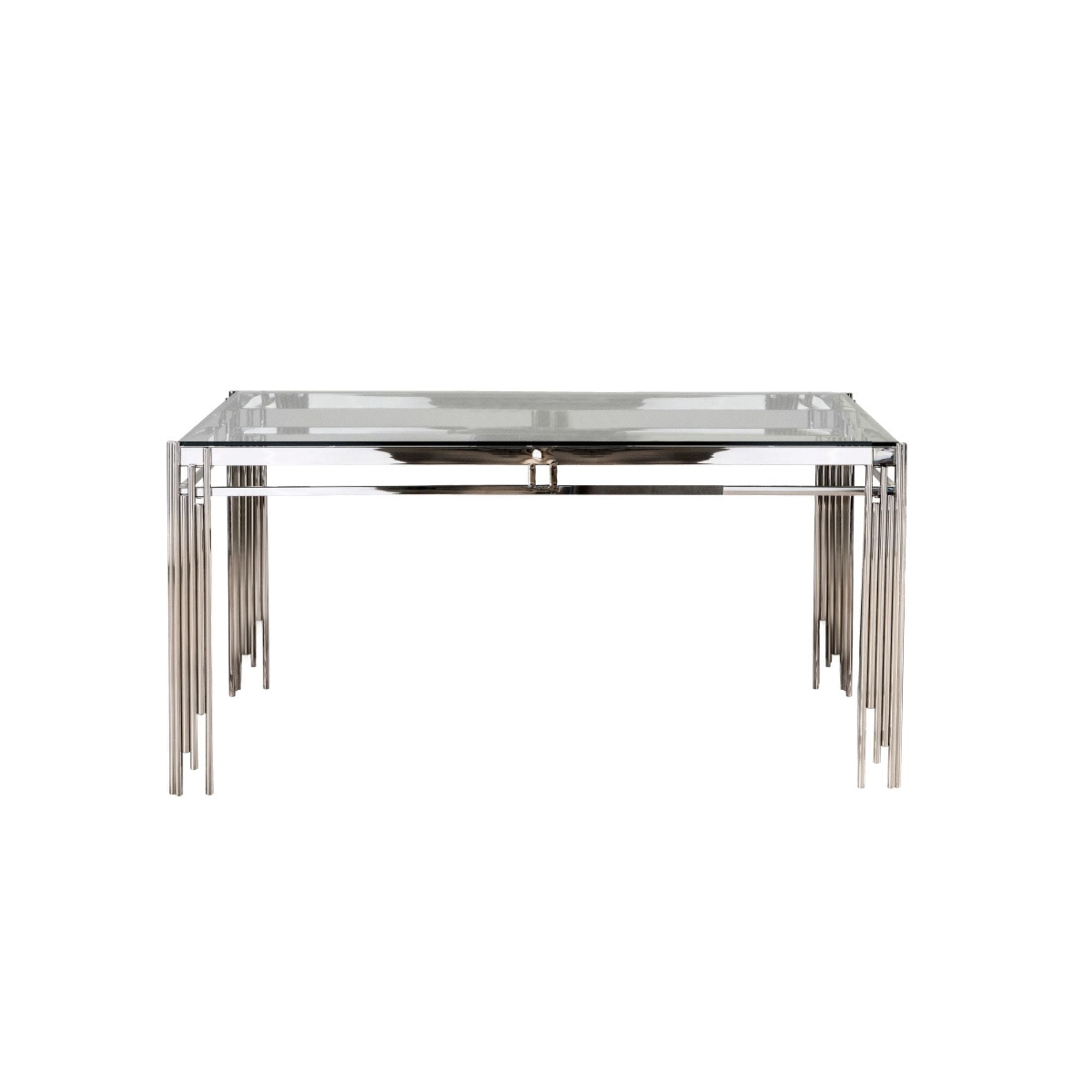 The Porfirio Dining Collection blends architectural artistry with modern design. A glass-top table rests on silver metal rods resembling a city skyline, while matching chairs feature a sleek floating frame and light arm support. Pebble-textured faux leather upholstery in charcoal grey, grey, or white completes the contemporary look.